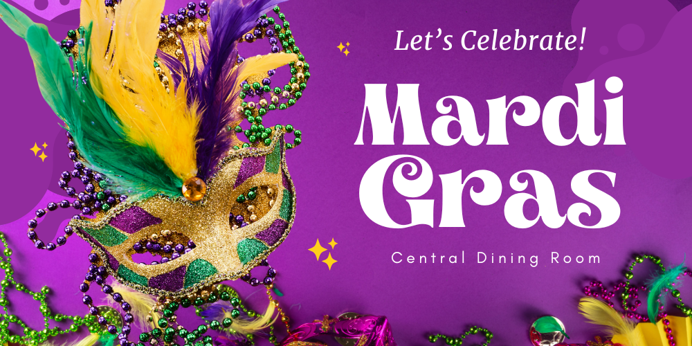 Enjoy a festive Mardi Gras meal with themed dishes, beads, and bright decorations.